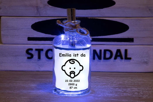 Stoamandal Flaschenpost - Geburt - personalisiert - LED Flaschenpost beleuchtet