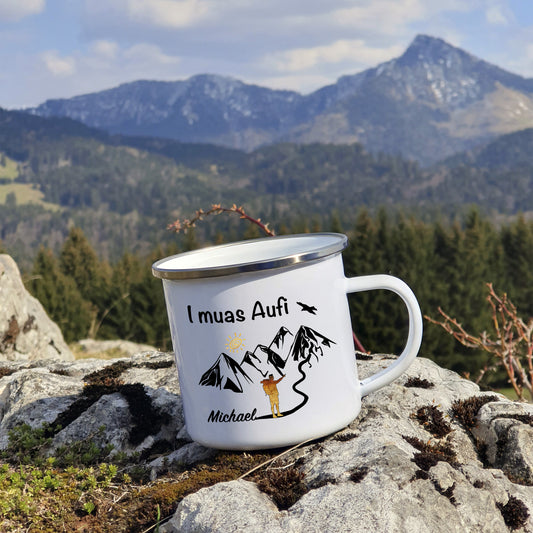 Tasse - I muas Aufi - Bergsteiger personalisiert - Emaille (Silber)