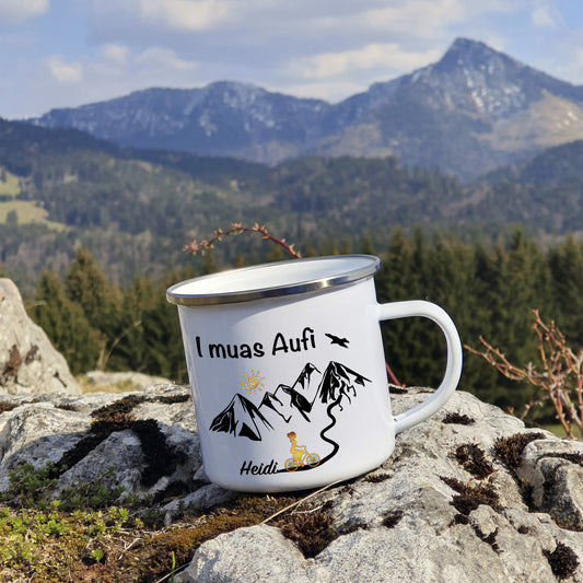Tasse - I muas Aufi - Berg-Läuferin personalisiert - Emaille (Silber)